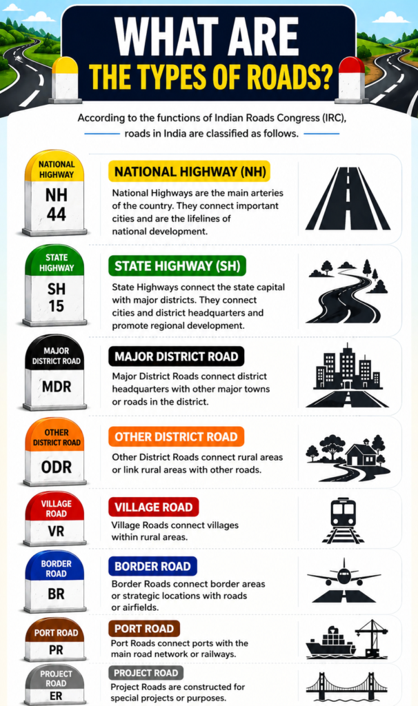 India’s road network spans over 63 lakh kilometres, making it one of the largest in the world. To help commuters, drivers, and emergency services quickly identify road types and jurisdiction, the government uses a standardised colour-coding system on the kilometre stones (also called KM stones or milestones) placed every kilometre along roads.